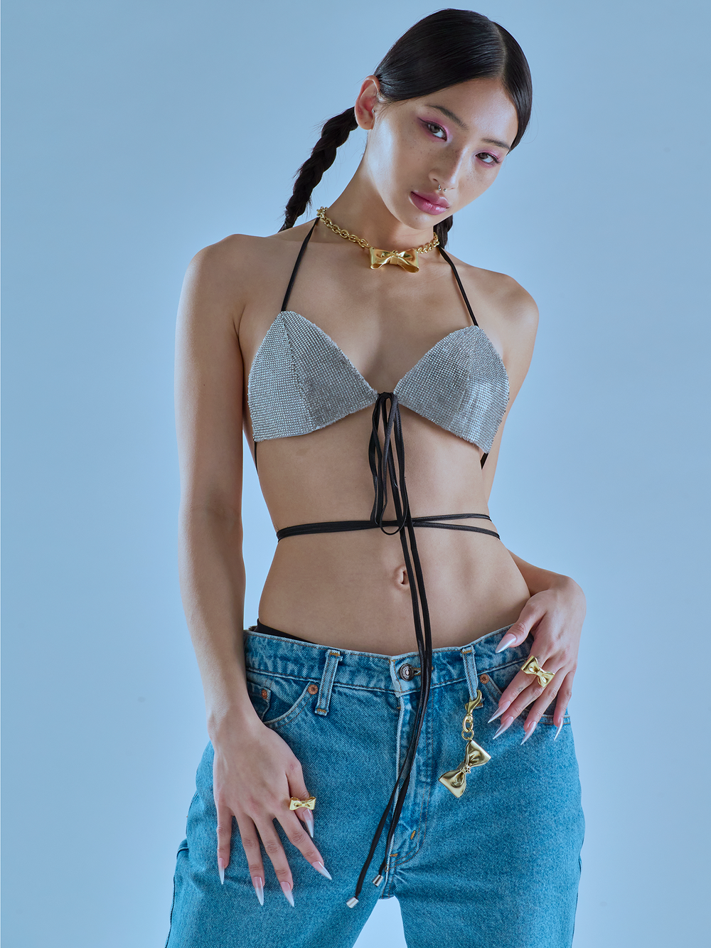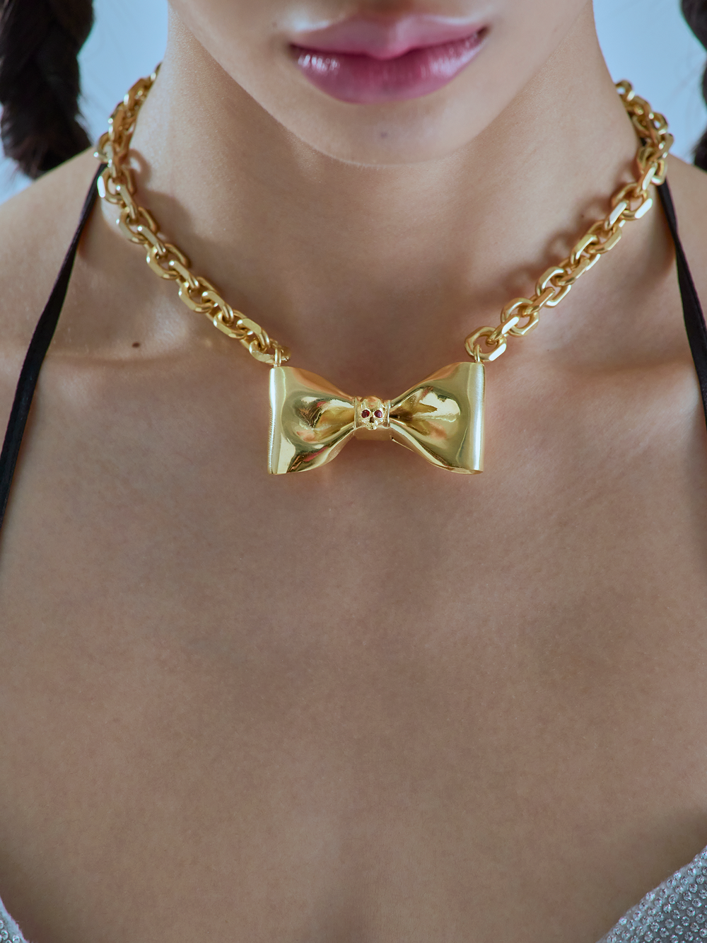 새로운 컬렉션의 시그니처 제품인 Reborn Ribbon Necklace 003은 가장 소녀스러운 상징인 리본에 스컬 장식을 가미함으로써 영감을 받은 캐릭터에 내재된 양면성을 표현하였습니다. 많은 이야기에서 죽음으로, 또 심상치 않은 사건으로 상징되는 스컬 장식이 역설적이게도 리본에 새로운 생명력을 불어넣습니다.