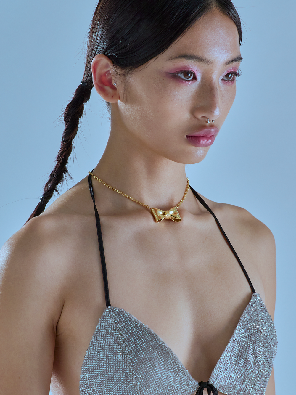 리본의 접힌 주름과 유려한 곡선, 천의 느낌 등을 금속으로 리얼하게 표현해 노악의 아이덴티티가 살아있는 시그니처 리본 목걸이입니다. 아름다우면서도 이질적인 강렬함을 느낄 수 있습니다.