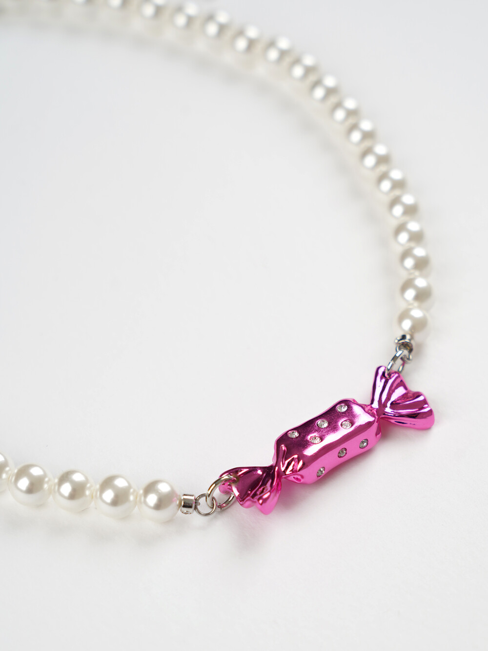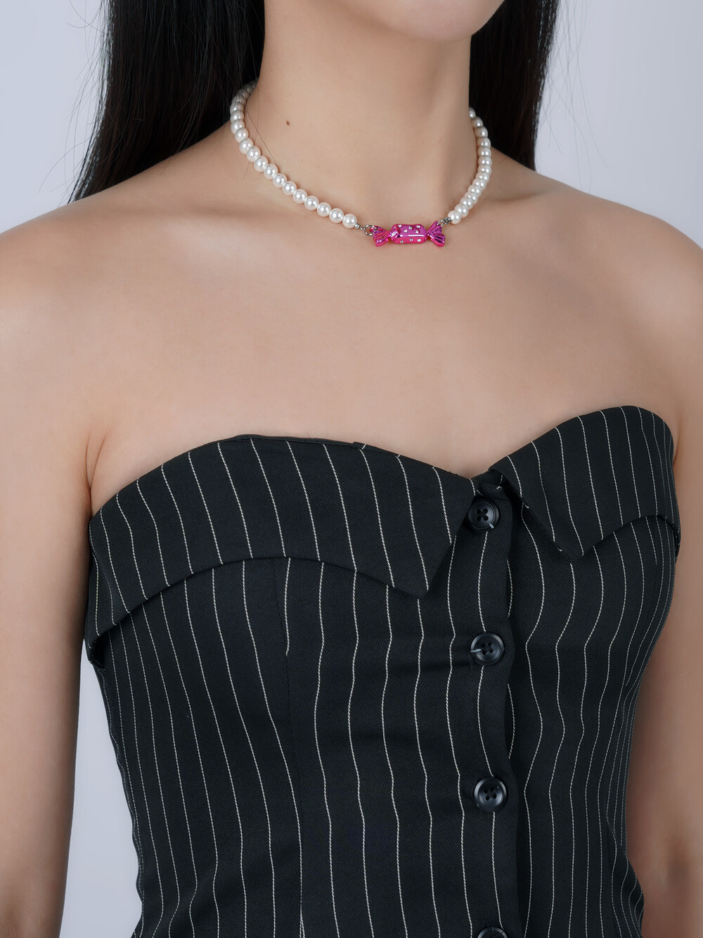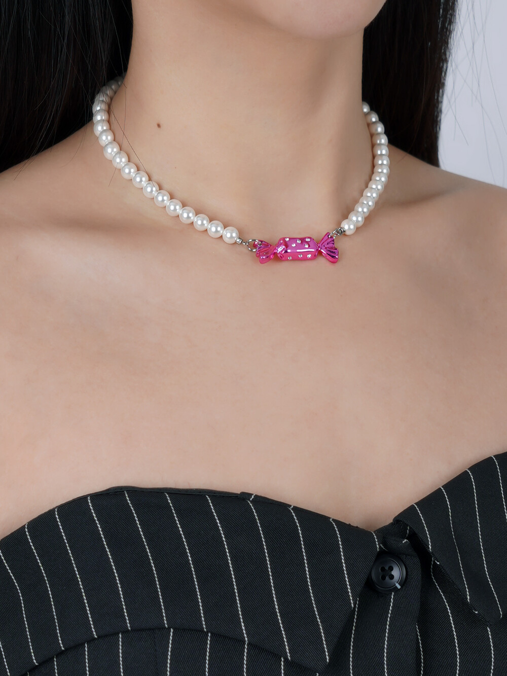 반짝이는 큐빅 사탕 팬던트와 화이트 진주목걸이의 조합이 시선을 사로잡는 목걸이입니다. 가장 선호도가 높은 6mm 사이즈의 진주를 사용해 활용도를 높였습니다.