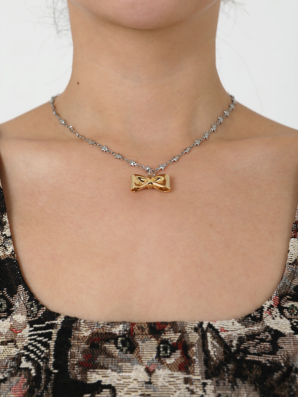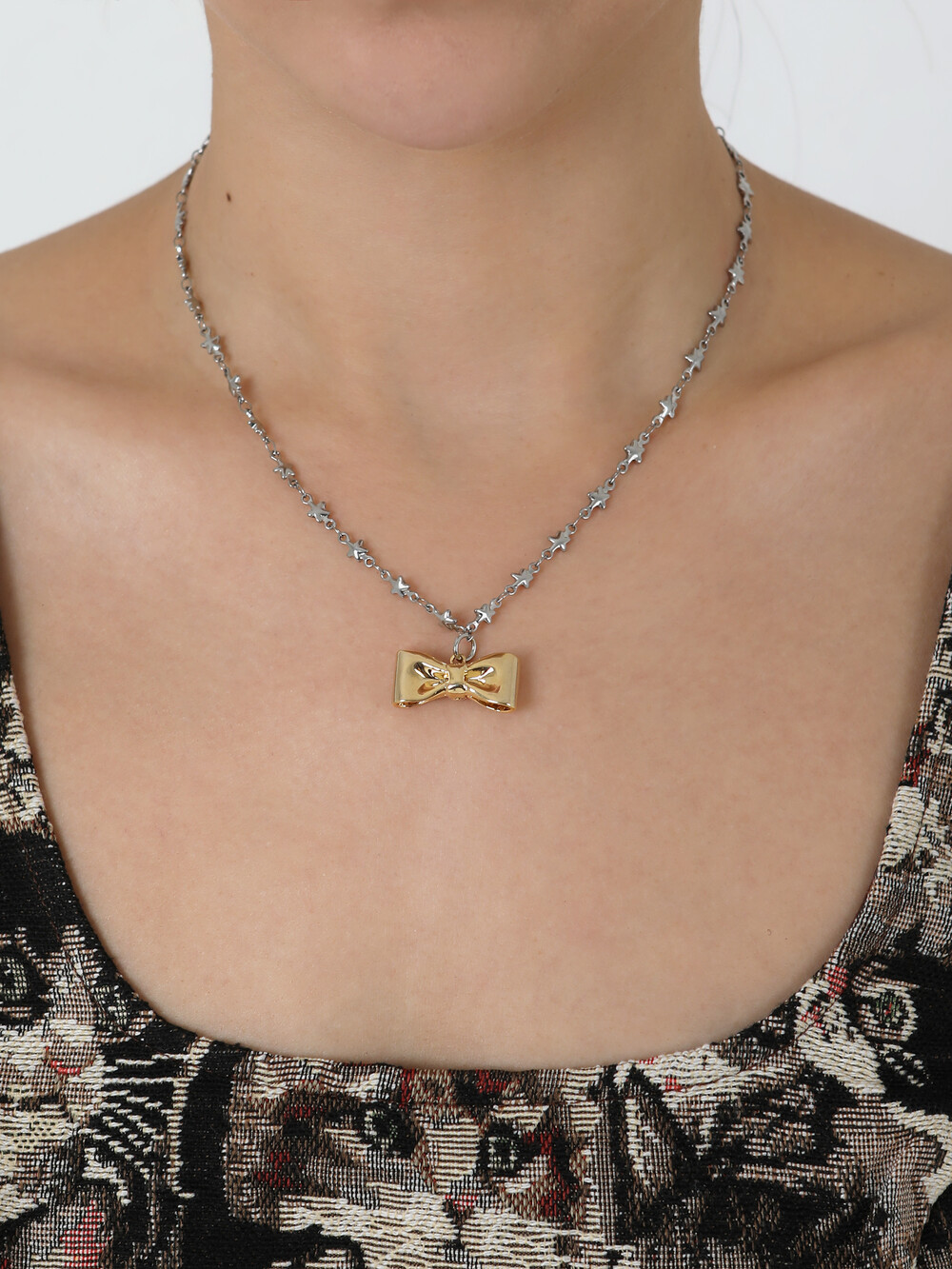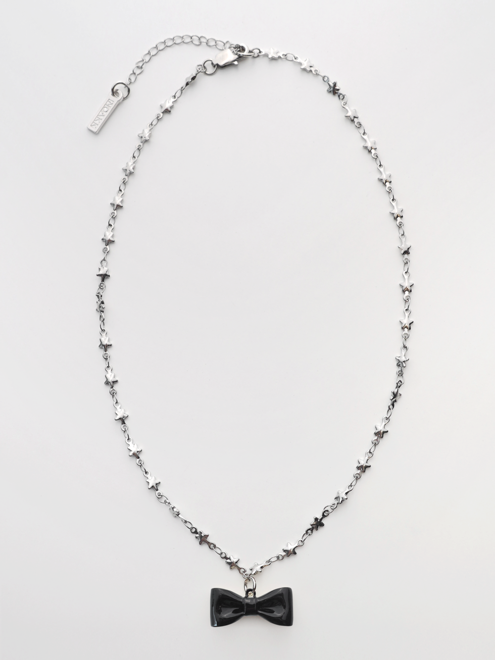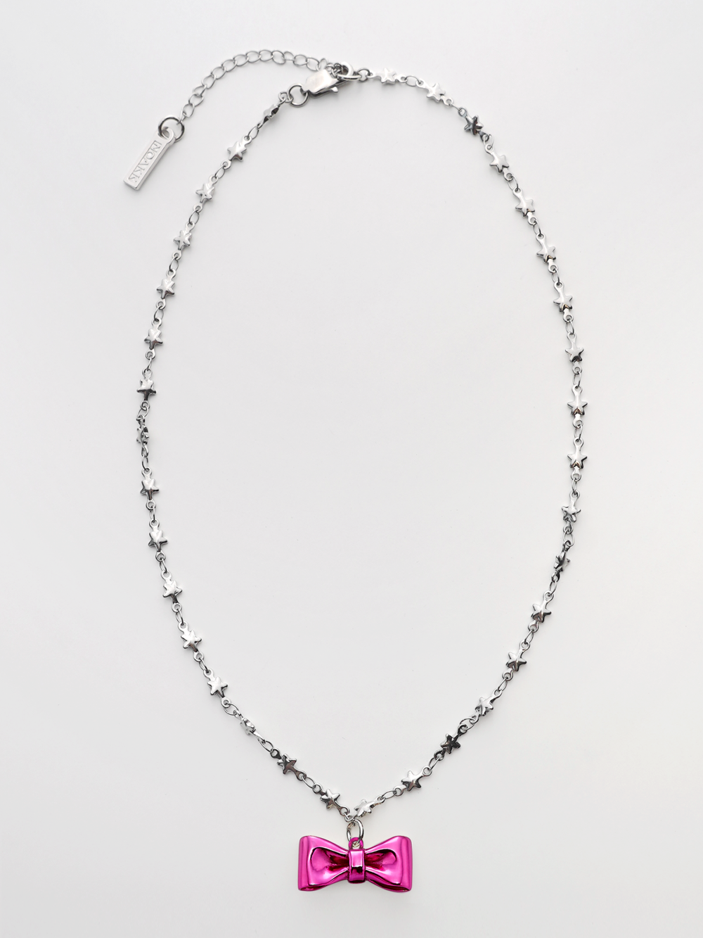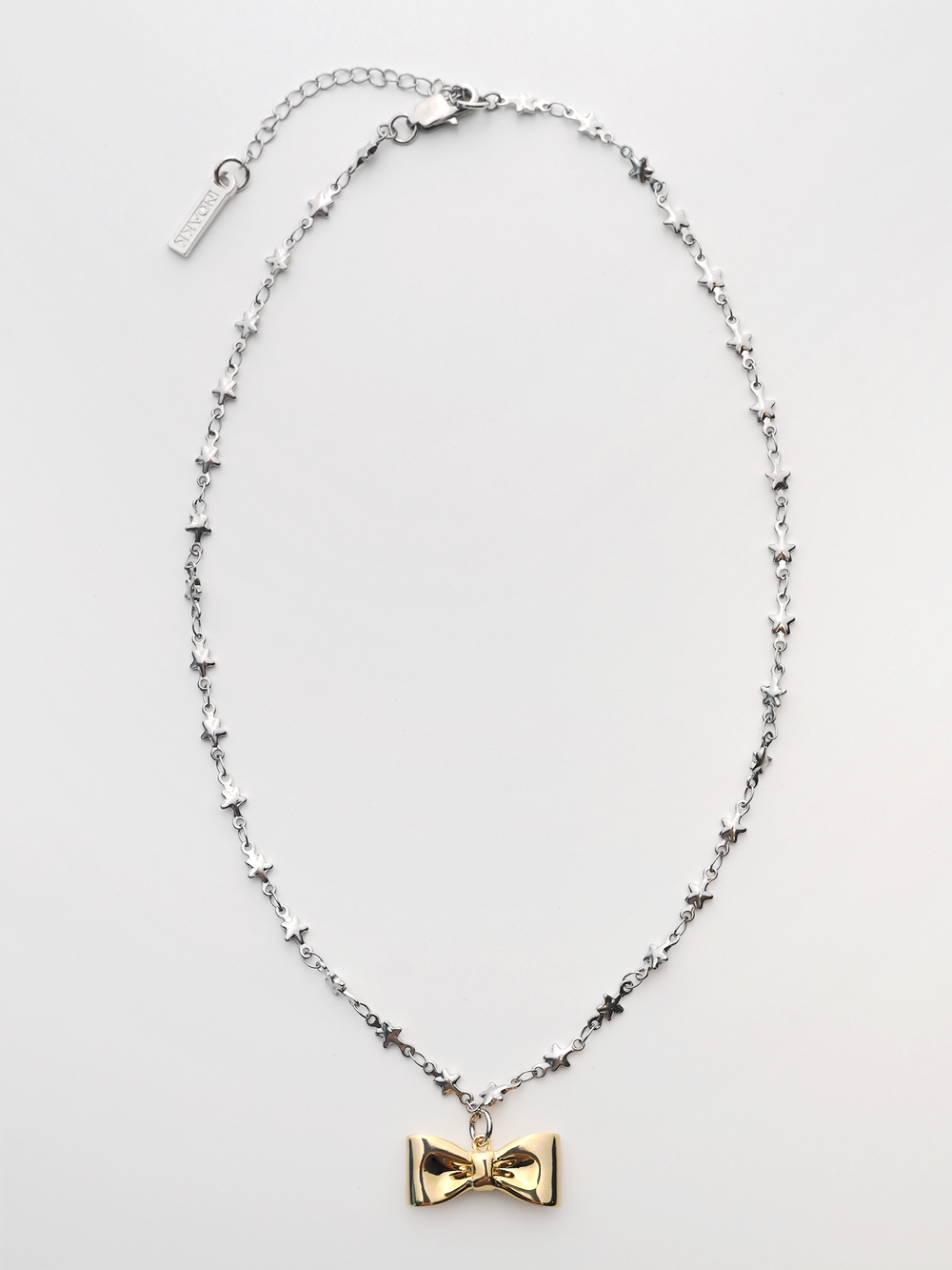 노악의 아이덴티티가 살아있는 시그니처 리본디자인의 목걸이입니다. 4가지 타입의 목걸이 줄에 따라 자신이 좋아하는 목걸이를 고를 수 있습니다. Reborn Ribbon Star Chain Necklace 001은 작은 별모양 체인으로, 귀엽고 레트로한 무드를 낼 수 있는 목걸이입니다.