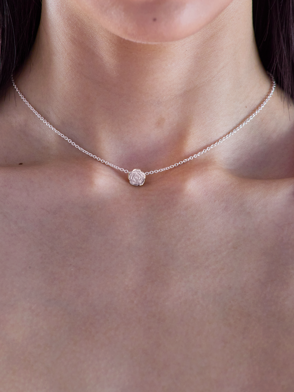 데일리하고, 핏이 좋은 목걸이를 위해 만든 장미 목걸이입니다. 장미의 겹겹의 잎을 섬세한 핸드크라프트로 표현해, 작지만 디테일이 살아있는 펜던트의 목걸이입니다. 펜던트와 체인 전부 sterling silver 925 재질로, 기본 아이템으로 유용한 제품입니다.