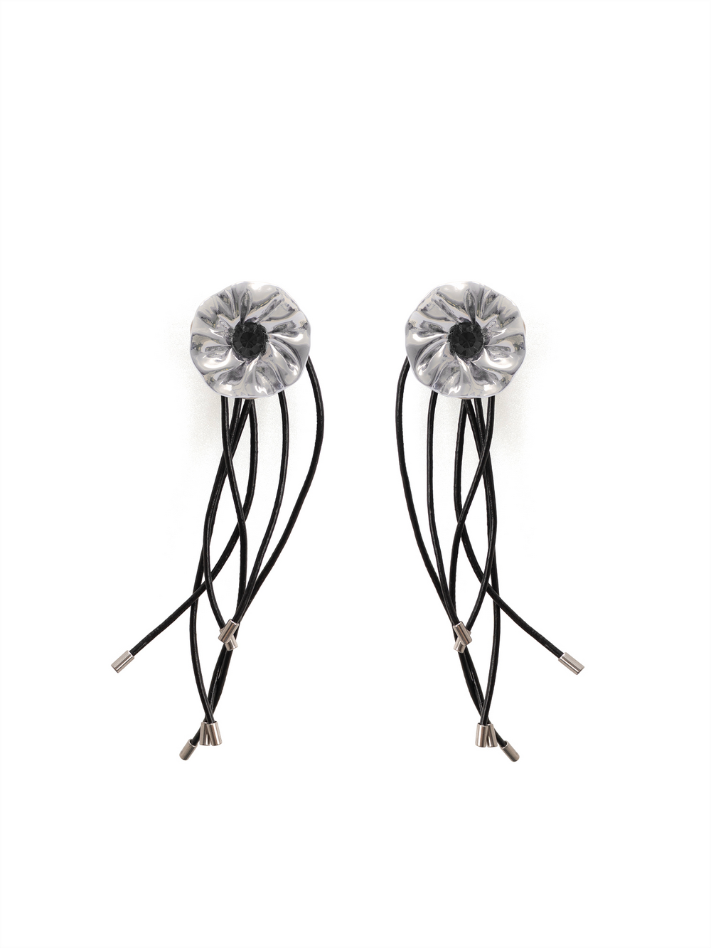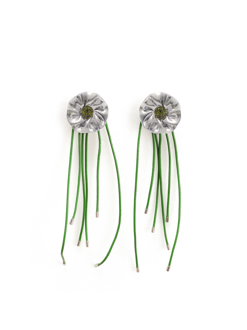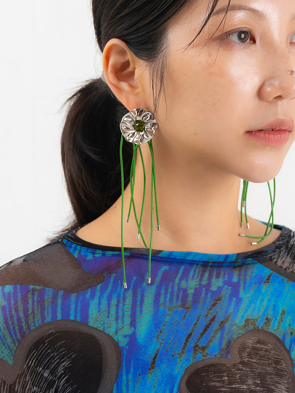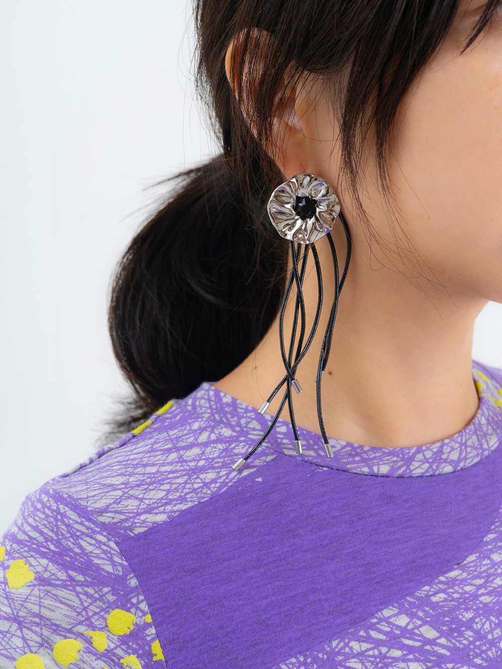 플라워 펜던트의 큰 사이즈인 002 사이즈로 디자인한 귀걸이입니다. 펜던트에 여러 줄의 가죽 끈을 더해, 과잉의 미학을 통해 본질을 들여다보는 <Too Flower> 캠페인의 가치를 잘 담아낸 제품입니다. 스와로브스키 큐빅과 가죽 끈의 컬러를 맞추어 완성했습니다.