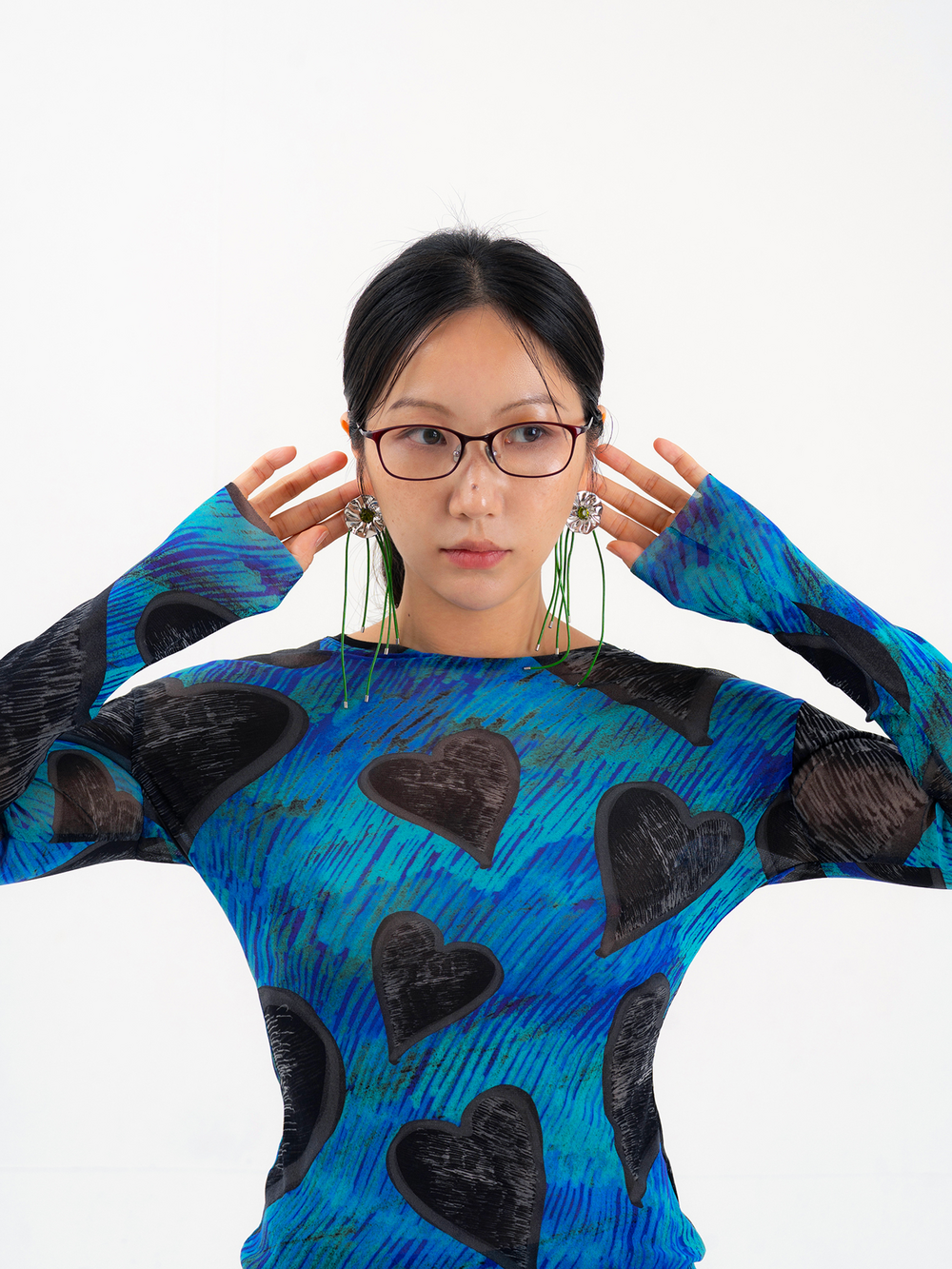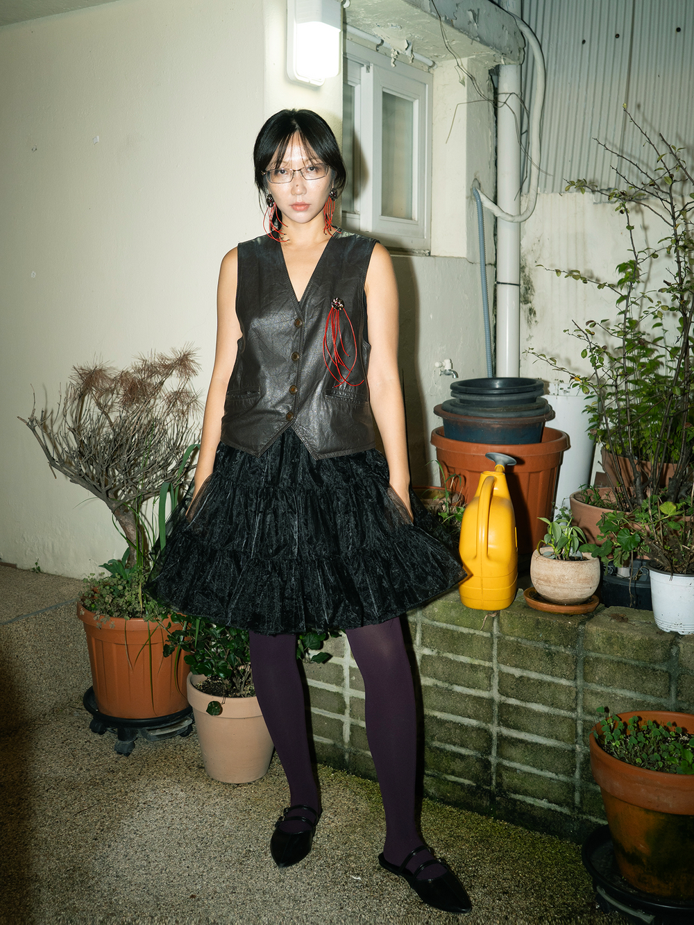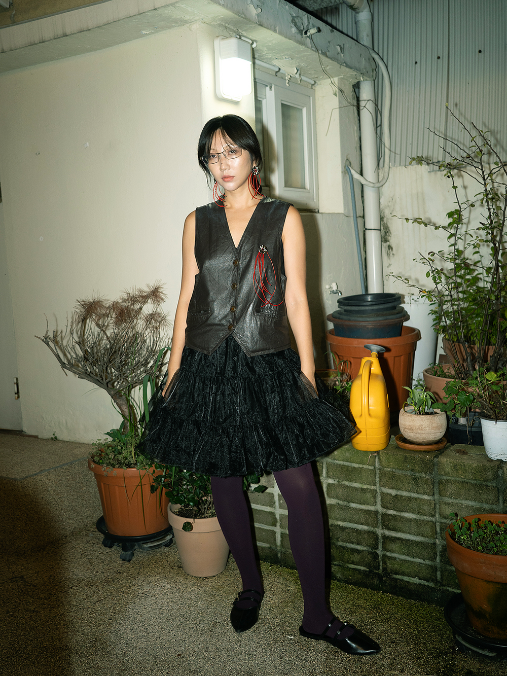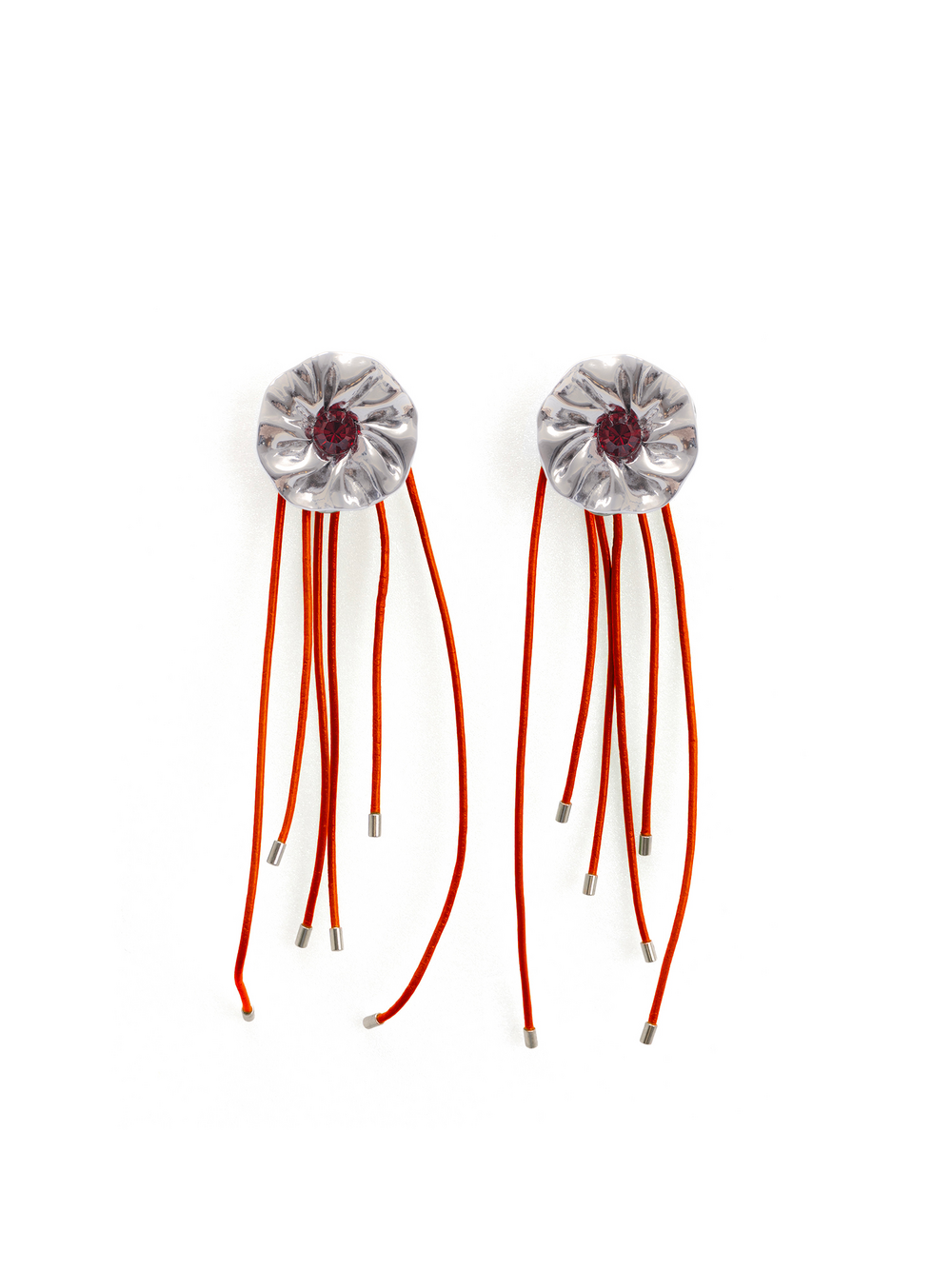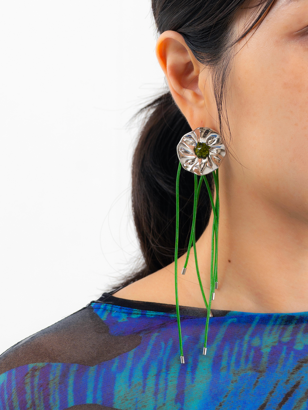 플라워 펜던트의 큰 사이즈인 002 사이즈로 디자인한 귀걸이입니다. 펜던트에 여러 줄의 가죽 끈을 더해, 과잉의 미학을 통해 본질을 들여다보는 <Too Flower> 캠페인의 가치를 잘 담아낸 제품입니다. 스와로브스키 큐빅과 가죽 끈의 컬러를 맞추어 완성했습니다.